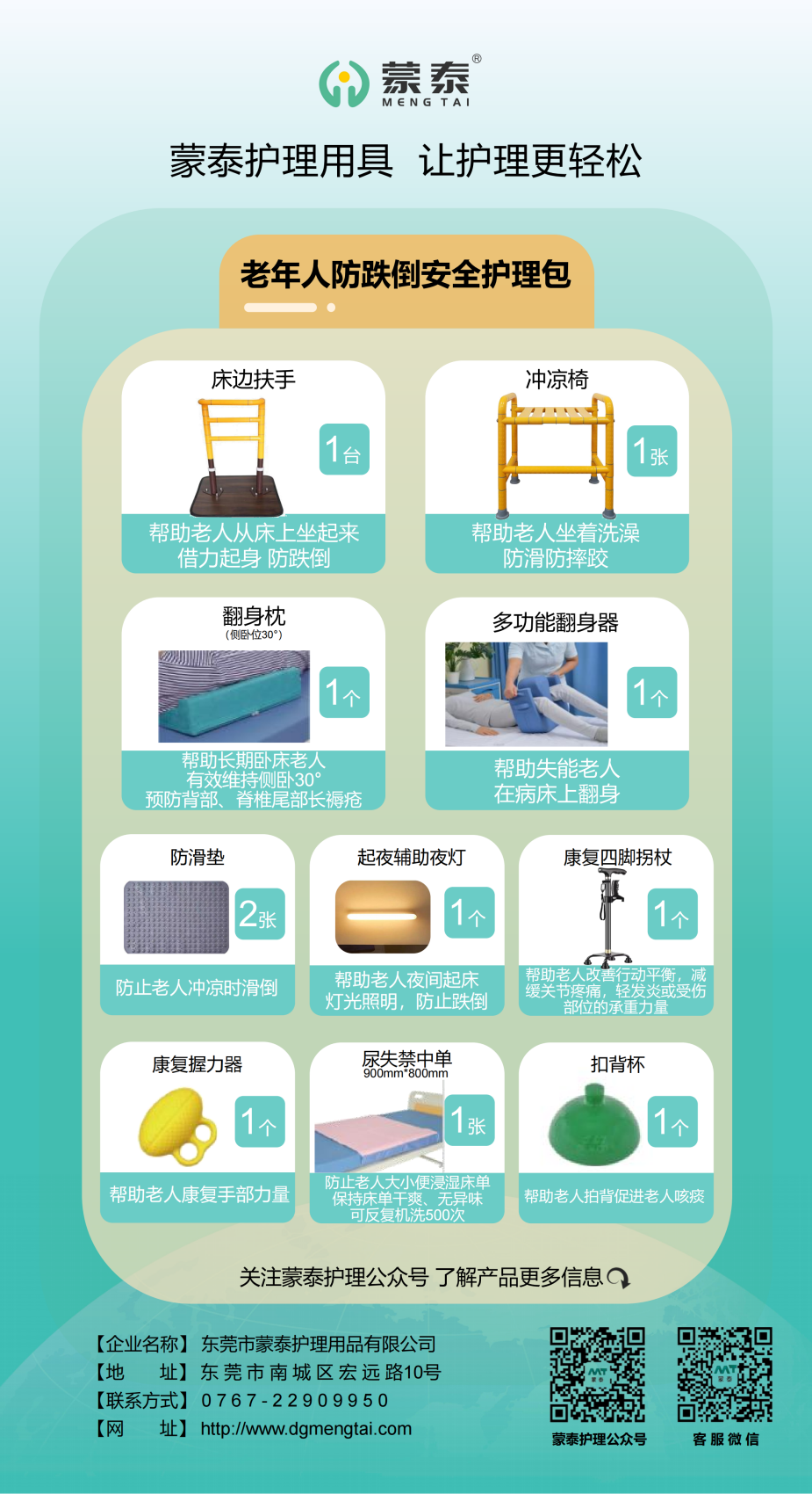 為了更全面服務(wù)地老年人群及傷、病、殘人群,蒙泰護(hù)理全新推出的7大護(hù)理包,包括:老人防摔倒安全護(hù)理包、失能老人護(hù)理包,失智老人護(hù)理包、防褥瘡安全護(hù)理包,精神類康復(fù)護(hù)理包,輪椅安全護(hù)理包和移位安全護(hù)理包。
