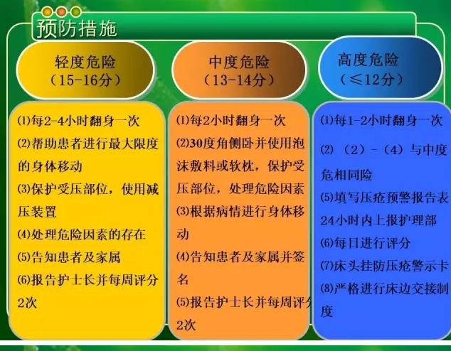 當(dāng)有壓瘡發(fā)生的風(fēng)險是,醫(yī)護人員應(yīng)對患者以及家屬進行壓瘡預(yù)防知識的培訓(xùn),具體如下圖,特別是翻身技巧與防壓瘡床墊的使用。