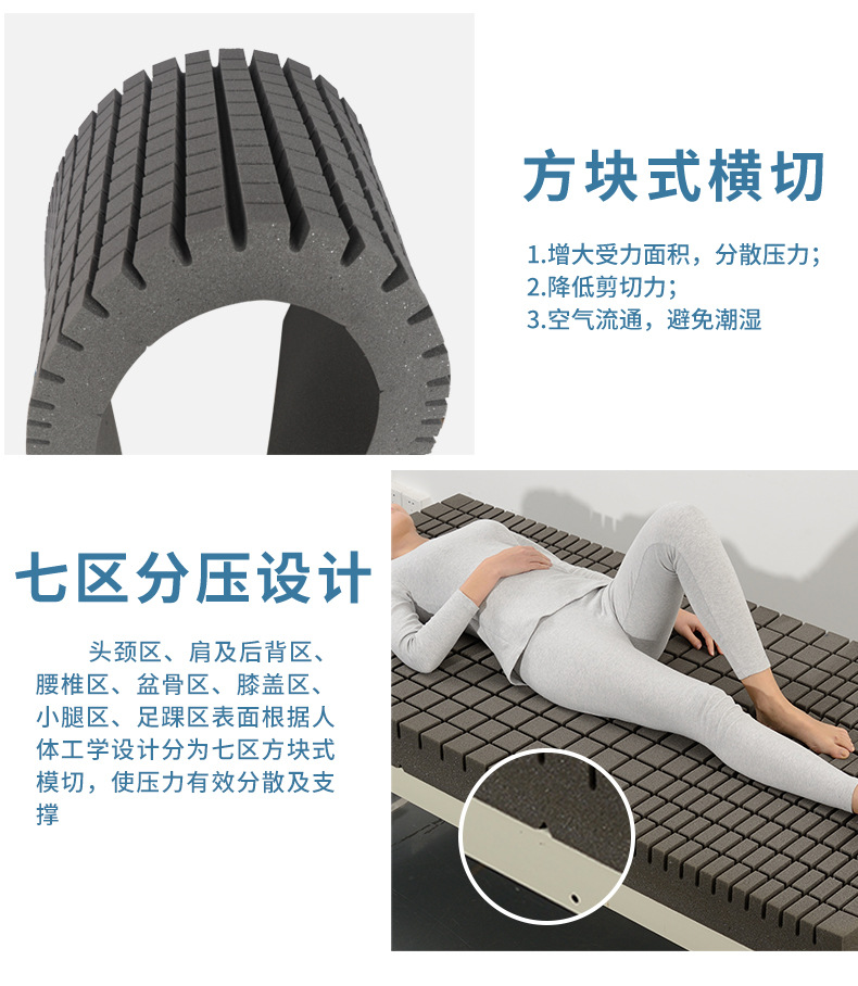 黑色海綿的防褥瘡床墊是由U型高硬度基座加方塊模切減壓墊組成,可以承受240公斤,U型高硬度基座堅(jiān)固便于支撐患者,起良好的固定作用,防止海棉下滑,不僅適合中輕度風(fēng)險(xiǎn)病人使用,高壓瘡風(fēng)險(xiǎn)病人也可以使用。