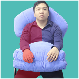 4、椅坐位:下肢體位墊放于肩頸頭部,上肢體位墊折疊放于大腿上,雙上肢放于上肢體位墊上。
