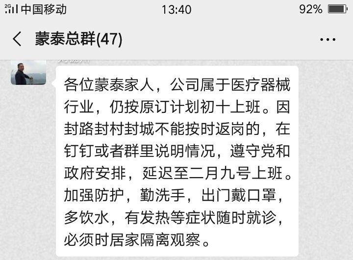 蒙泰護(hù)理作為一家醫(yī)療器械有限公司,一直致力于減輕護(hù)理人員的工作負(fù)擔(dān),對(duì)于這次的疫情也時(shí)刻關(guān)注著,原定初十上班,領(lǐng)導(dǎo)們經(jīng)過(guò)慎重考慮后,仍選擇了按照原計(jì)劃實(shí)行,因?yàn)槊商┳o(hù)理作為一家醫(yī)療器械公司,能夠?yàn)樽o(hù)理人員尋找所需物品,幫助護(hù)理人員。雖然按照計(jì)劃初十上班,但是生命重于泰山,蒙泰護(hù)理公司對(duì)于初十到崗上班不是強(qiáng)制性的,以避免疫情蔓延為主,對(duì)于蒙泰家人們的不同地區(qū)情況,不能按時(shí)初十上班,蒙泰護(hù)理領(lǐng)導(dǎo)們都理解以及同意了他們的請(qǐng)求,并時(shí)刻關(guān)注蒙泰家人們的情況,要求做好防護(hù),在避免疫情的蔓延中,蒙泰人一直在行動(dòng)。