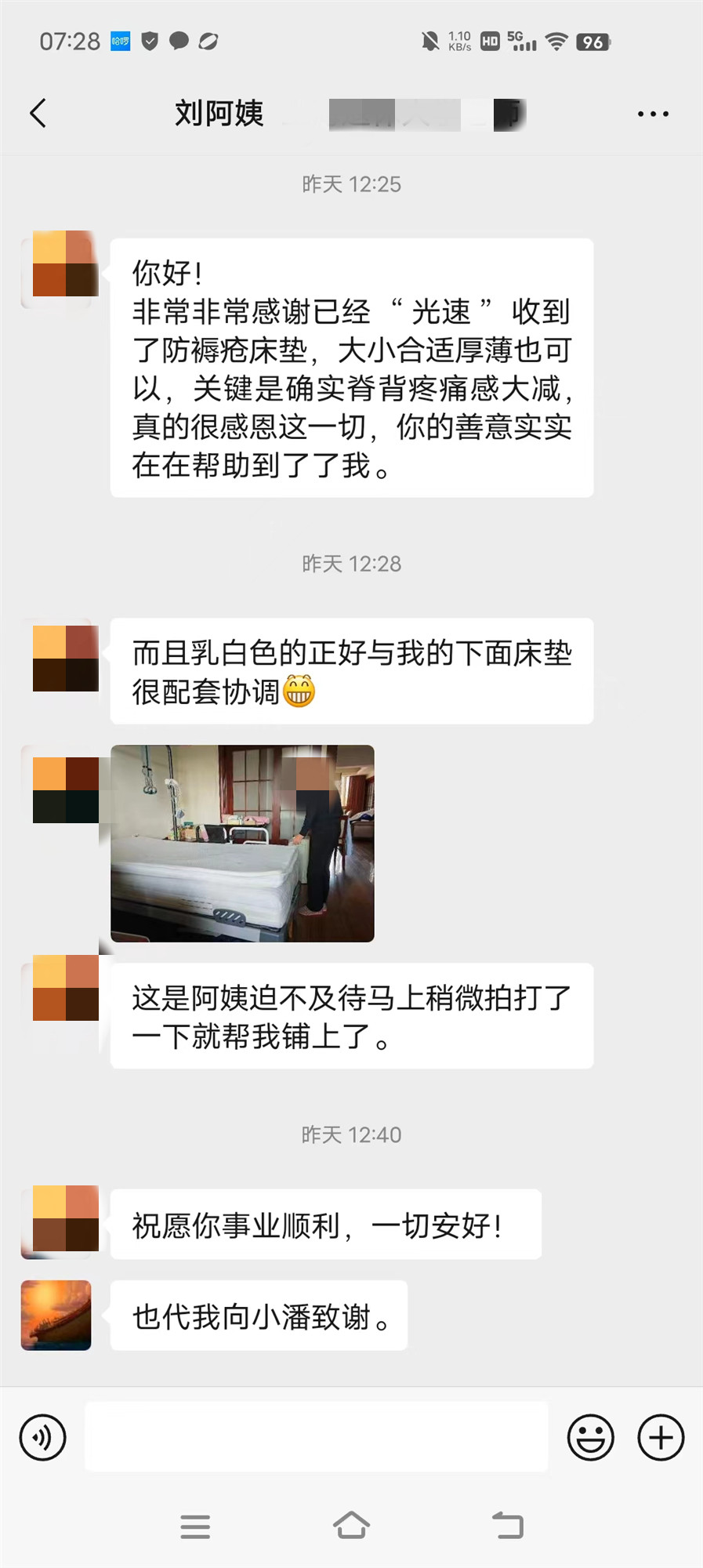 除了產(chǎn)品的優(yōu)良性能外,蒙泰的服務(wù)也獲得了劉老師的高度評(píng)價(jià)。從定制、生產(chǎn)到配送,蒙泰都為她提供了細(xì)致周到的服務(wù)。尤其是“光速”般的配送速度,讓她在短時(shí)間內(nèi)就感受到了蒙泰靜態(tài)防壓瘡床墊帶來(lái)的舒適體驗(yàn)。