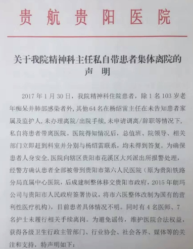 2017年2月4日訊,據(jù)貴航貴陽(yáng)醫(yī)院網(wǎng)站消息,貴航貴陽(yáng)醫(yī)院4日發(fā)布《關(guān)于我院精神科主任私自帶患者集體離院的聲明》,《聲明》稱,2017年1月30日,該院精神科住院患者,除1名103歲老年癡呆并肺部感染者外,其他64名在楊紹雷主任未告知患者家屬及監(jiān)護(hù)人,未辦理離院/出院手續(xù),未申請(qǐng)調(diào)離/辭職等情況下,私自將患者帶離醫(yī)院。同時(shí)有4名醫(yī)師、7名護(hù)士未履行相關(guān)手續(xù)離崗。