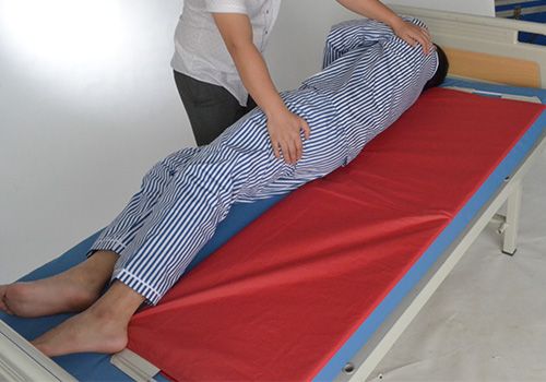 第一步,操作者站在患者擬翻向的一側(cè),兩手各扶持患者的肩部和臀部,輕將患者向?qū)?cè)翻30度左右后。