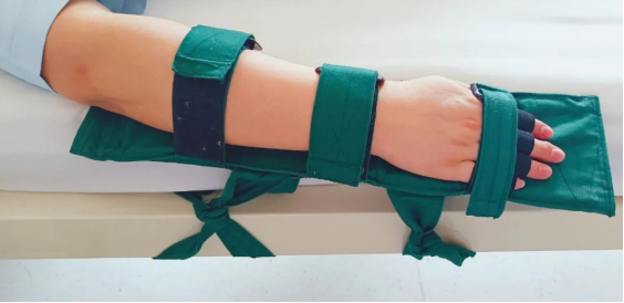 現(xiàn)有的醫(yī)用固定帶存在很多不足:患者腕部及手臂固定帶窄,患者舒適度差,受力面積小,易出現(xiàn)皮膚摩擦,導致皮膚破潰。一些不配合的患者,不能有效地固定其手指部,容易發(fā)生管路滑脫事件,影響治療的連續(xù)性。材料為滌綸材質(zhì),透氣性、舒適度不好,消毒、清洗不方便。