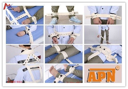精神科約束帶作為一種必要的保護(hù)性約束用具在臨床經(jīng)常使用,也承擔(dān)著很重要的保護(hù)作用。在使用中有四肢約束的,有雙手約束的,有肩部約束的,直接約束手到床上居多的,也有兩個(gè)手拿著約束帶,然后互相反向一扭出一個(gè)圈的,也有四肢約束的,約束的方法很多,那么到底有多少種綁法呢?醫(yī)用約束帶生產(chǎn)廠家為您圖示: