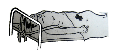 B. 上臂固定法 將大單折成寬帶狀,橫在病人身下,帶的上邊壓在腋下,將帶自纏繞上臂,從雙臂下方向外側(cè)方拉出,系于床緣邊上。如下圖: