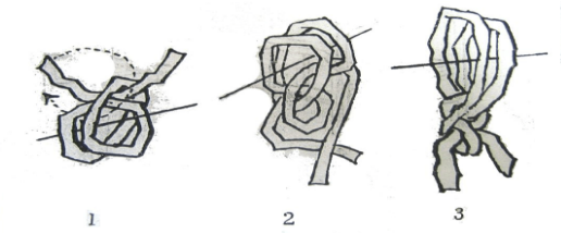 取布帶中間部位,將其折成兩個套(如圖),套在病人的手腕或踝部,再將兩邊長帶分別從套結(jié)中間下面穿過拉出,在上面打結(jié)之后,將余帶系于床欄上固定好。