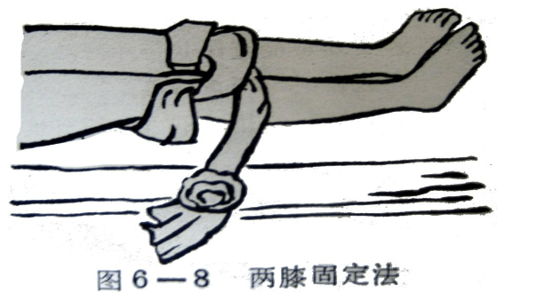C. 兩膝固定法 將大單斜疊成寬帶橫放在大腿下面,拉著寬帶的兩端使向內(nèi)側(cè)壓在腿上,并穿過下面橫帶,再拉向外側(cè)使其壓住膝部,將兩端系于床緣。如下圖: