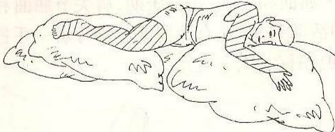 1、 在患者軀干前方及后方各置一軟枕,以保持軀干呈完全側(cè)臥位而非半腹臥位。