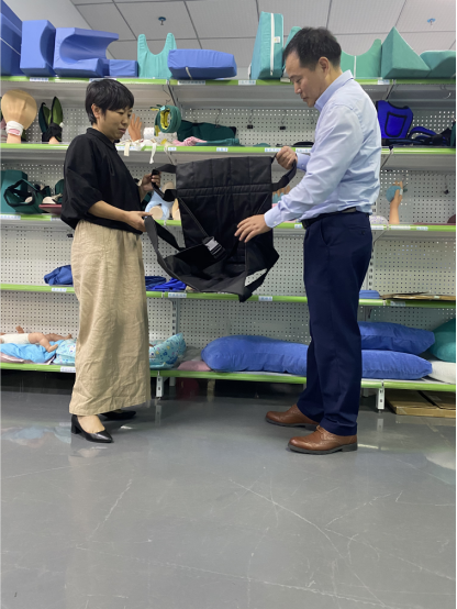 來自江蘇做居家養(yǎng)老護理上門服務(wù)的徐總,看到了蒙泰護理展廳上擺放的一款移位帶,愛不釋。徐總說:在蘇州的一些老城區(qū),沒有電梯,老人要到戶外活動,比如說去醫(yī)院復(fù)診等,是一件很難的事,把老人背著下樓,護理人員費力費神,老人還不安全,有可能被后仰、滑落等不良事件發(fā)生。