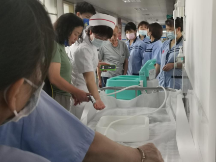 5月23日,蒙泰護理創(chuàng)始人陳仁英帶領團隊來到了東莞水鄉(xiāng)中心醫(yī)院,為護長、護工們培訓教學自動助浴機的操作流程。