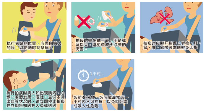4.5 飯前30分鐘、飯后或灌食后一小時(shí)內(nèi)不可拍痰、以免嘔吐造成吸入性危險(xiǎn)。