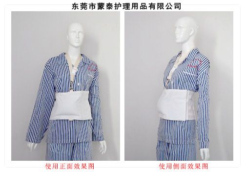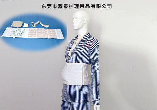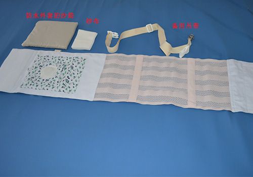 蒙泰護理肝硬化腹腔穿刺加壓腹帶由沙袋、紗布、備用吊帶、腰腹帶主體五部分組成。置于帶體1公斤的沙袋主要起加壓作用。沙袋用防水醫(yī)用布做外套,再置于腰腹帶內(nèi)。沙袋外囊正中設計的凸出圓點集中壓力點,在使用的時候正對腹穿刺點。內(nèi)置紗布用于吸收少量滲液。備用吊帶用于患者行走時掛在脖頸上,不用擔心加壓沙袋會脫落而長期處于臥姿。