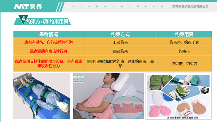 中華護(hù)理學(xué)會(huì)團(tuán)體標(biāo)準(zhǔn)T/CNAS 04—2019《住院患者身體約束護(hù)理》規(guī)定了住院患者身體約束的基本要求、約束評(píng)估、約束實(shí)施和約束解除等四大塊。蒙泰護(hù)理結(jié)合現(xiàn)有護(hù)理用具和科室需求特點(diǎn)增加了約束用具的選擇使用指南。