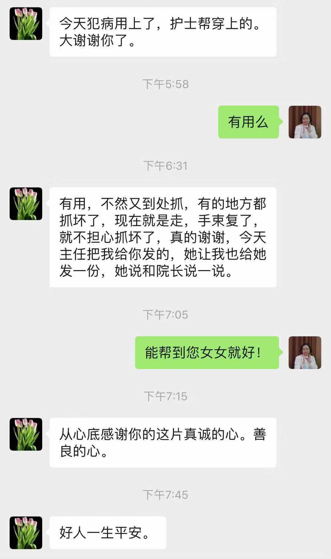 這位母親通過網(wǎng)絡(luò)找到了蒙泰,蒙泰業(yè)務(wù)經(jīng)理根據(jù)這位母親的講述,為其女兒配置了件約束衣!在其女兒犯病時(shí)穿上,限制其女兒雙手活動(dòng)的同時(shí)還可以隨意走動(dòng)。傷害不了了自身的皮膚,沒有新的傷口出現(xiàn),老母親省心多了,護(hù)士也省心多了!這位母親還特此發(fā)來了感謝,蒙泰也很欣慰能幫助到這位母親。希望蒙泰護(hù)理用具能幫到更多的病人、家屬、護(hù)士,愿更多的需要者受益!