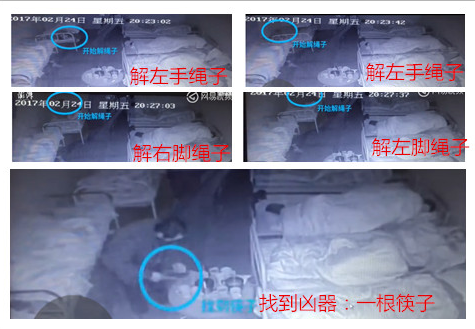 下圖為2017年2月23日20:23:02時(shí)間,患者開始解繩子(醫(yī)院稱是“精神科專用的保護(hù)帶”))圖四為20:27:37患者在解最后一條保護(hù)性約束帶。意思自解綁縛過程不到8分鐘,很顯然,從能解開第一根約束帶開始,已經(jīng)注定了這是一個(gè)悲劇。對于一個(gè)四防病區(qū)的患者能解開約束帶這樣的行為,后果可輕可重。