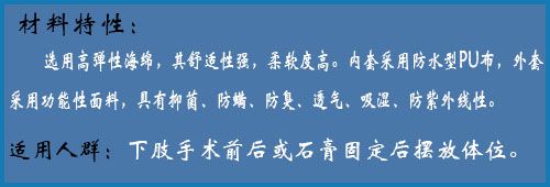 C-012-03下肢抬高墊3號(hào):選用的高彈性海綿,其舒適性強(qiáng),柔軟度高。內(nèi)套采用防水型PU布,外套采用功能性面料,具有抑菌、除螨、防臭、透氣、吸濕、防紫外線性。