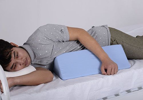 實(shí)施有效到位的翻身來間歇性地解除局部壓迫是預(yù)防壓瘡最為有效、關(guān)鍵的措施。一般臥床病人每1~2小時(shí)翻身1次,發(fā)現(xiàn)皮膚變紅,則應(yīng)每小時(shí)翻身1次,左、右側(cè)臥、平臥、俯臥位交替進(jìn)行,并用軟枕、氣枕、腋枕、氣墊圈、海綿圈、翻身枕、抬高墊等墊在骨突出部位,可起到局部懸空、減輕壓力的作用。