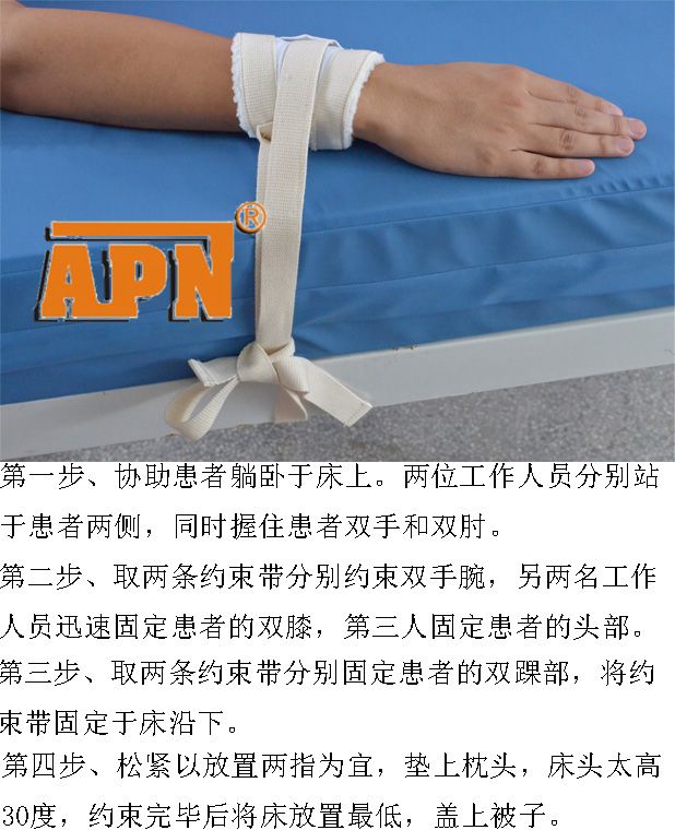 用于神志模糊躁動或因精神不自主異常病人,限制其手部腳部無意識的肢體活動,為了幫助患者不得不施加的方式。