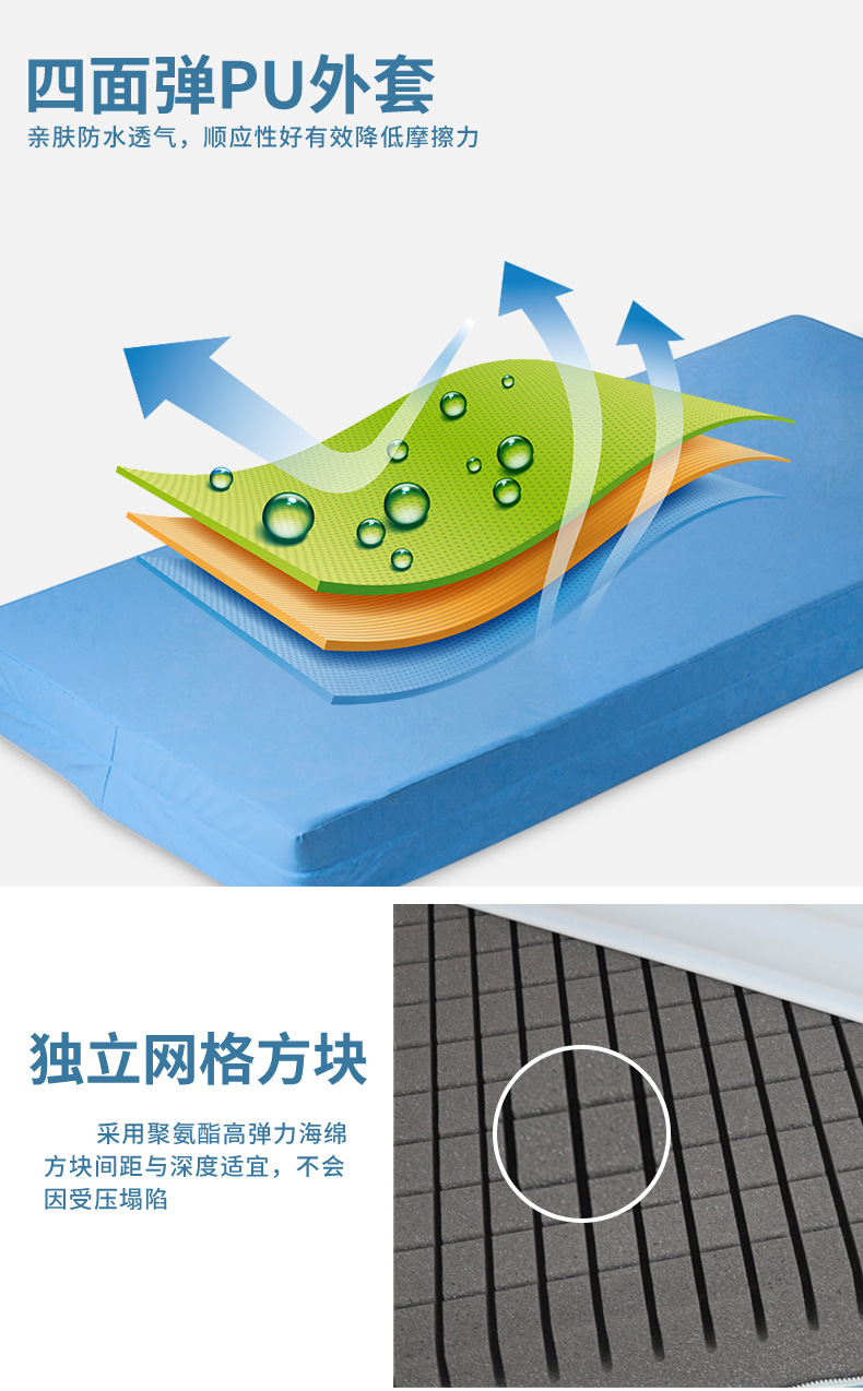 防壓瘡床墊由高彈力聚氨酯海綿組成,柔軟度好且回彈性強。