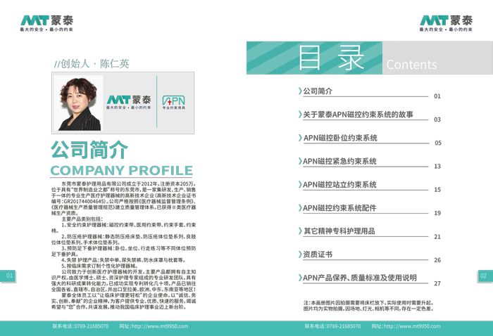 封面是我們的主打產(chǎn)品磁控約束帶,首頁是我們創(chuàng)始人及公司簡介。一拿到手就被蒙泰磁控約束系統(tǒng)的小故事吸引了,非常深刻而有趣的畫冊。在新畫冊中,我們還在每個產(chǎn)品下面還添加了一個二維碼,不會操作的還可以觀看使用視頻,了解這個產(chǎn)品如何操作!
