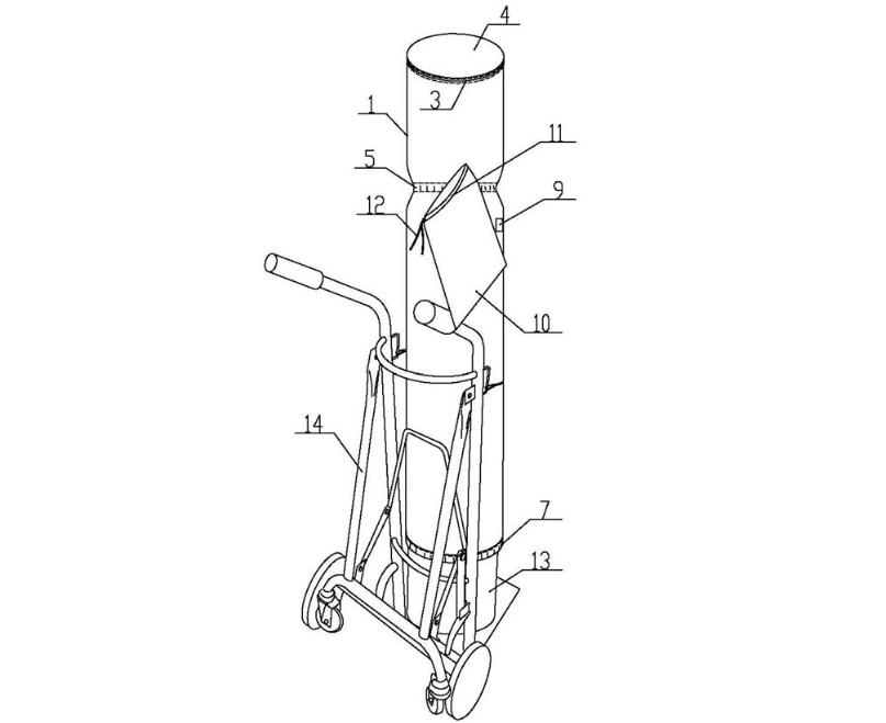 氧氣在醫(yī)院臨床各科疾病治療中使用非常普遍,除部分醫(yī)院使用中心供氧系統(tǒng)外,大部分醫(yī)院仍使用氧氣筒提供氧源。目前通常使用小推車放置及運送氧氣筒,氧氣筒上的流量調(diào)節(jié)開關(guān)、氧氣壓力表、濕化瓶、氧氣輸出口等部件易污染及粘附灰塵。每次使用前需要消毒及除塵,費時費力、影響工作效率。此外,現(xiàn)有氧氣筒的無法實現(xiàn)其實時定位,致使各氧氣筒的監(jiān)管維護較為不便,影響了其使用效率。