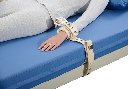 約束帶由布和尼龍搭扣制成。使用時(shí)將約束帶置于關(guān)節(jié)處,被約束部位墊襯墊,對(duì)合尼龍搭扣,將帶子系于床緣。