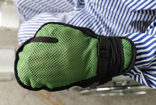 先將雙手分別放入約束手套內(nèi),再將尼龍粘帶粘好,松緊度以塞進兩指為宜,然后將縫在手套袖口邊帶子交叉打一活結(jié),最后系在床緣上。