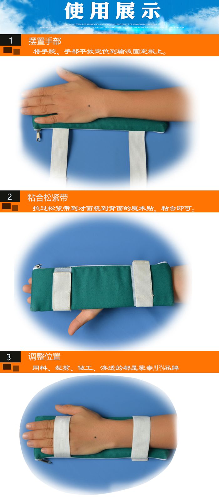 【產(chǎn)品作用】:固定手背與前臂,避免晃動導(dǎo)致在手背或前臂處靜脈輸液的患兒穿剌針滑脫至血管外而引起的脫針、鼓包現(xiàn)象,保證患者輸液順利進(jìn)行,減少了反復(fù)穿刺的痛苦,保護(hù)患兒血管的同時,減輕了護(hù)士工作量。