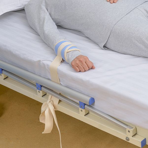6、固定另一端:將約束帶兩端的固定帶固定到穩(wěn)定的床沿或椅子。(也可事先在病床上固定好約束帶,需要使用時固定患者腕部或踝部即可)