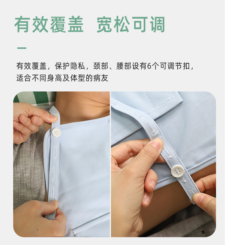 有效覆蓋,保護隱私,頸部、腰部設(shè)有6個可調(diào)節(jié)扣,適合不同身高及體型的病友。