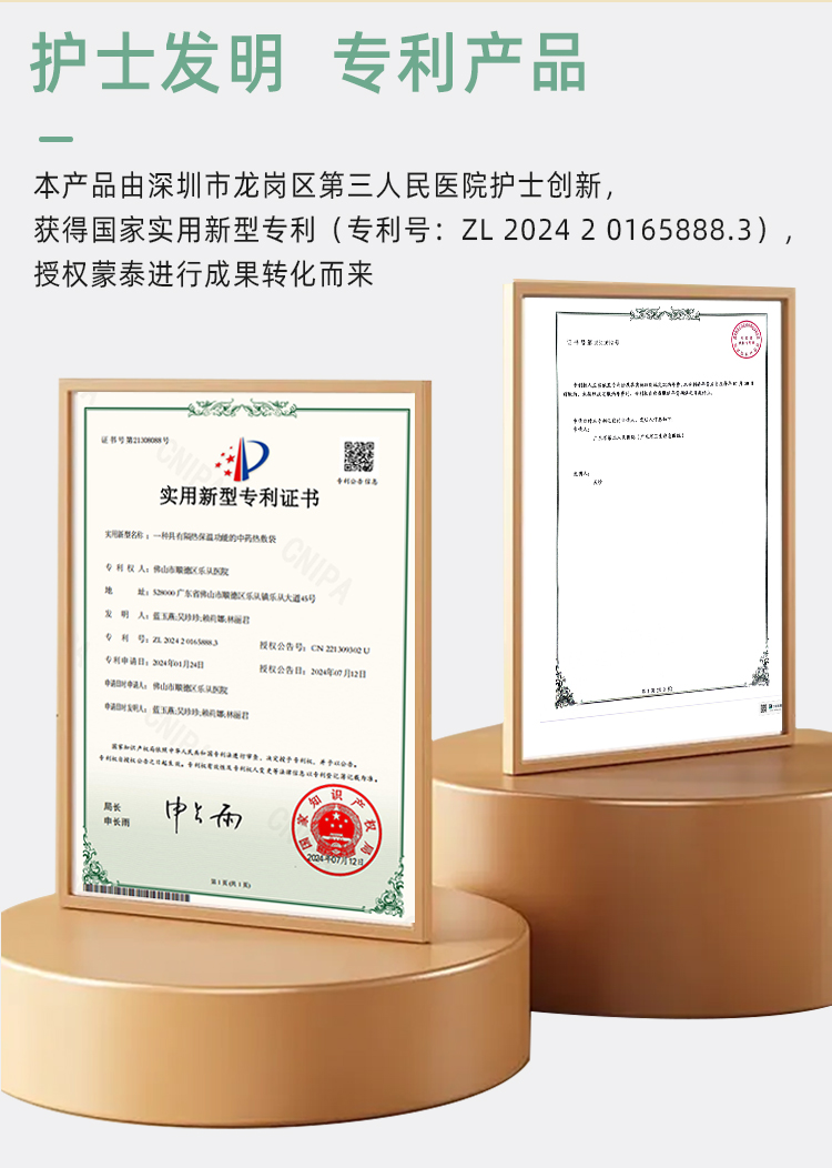 醫(yī)用隔熱保溫中藥熱敷袋由深圳市龍崗區(qū)第三人民醫(yī)院護士創(chuàng)新獲得國家實用新型專利(專利號:ZL202420165888.3)授權蒙泰進行成果轉化而來