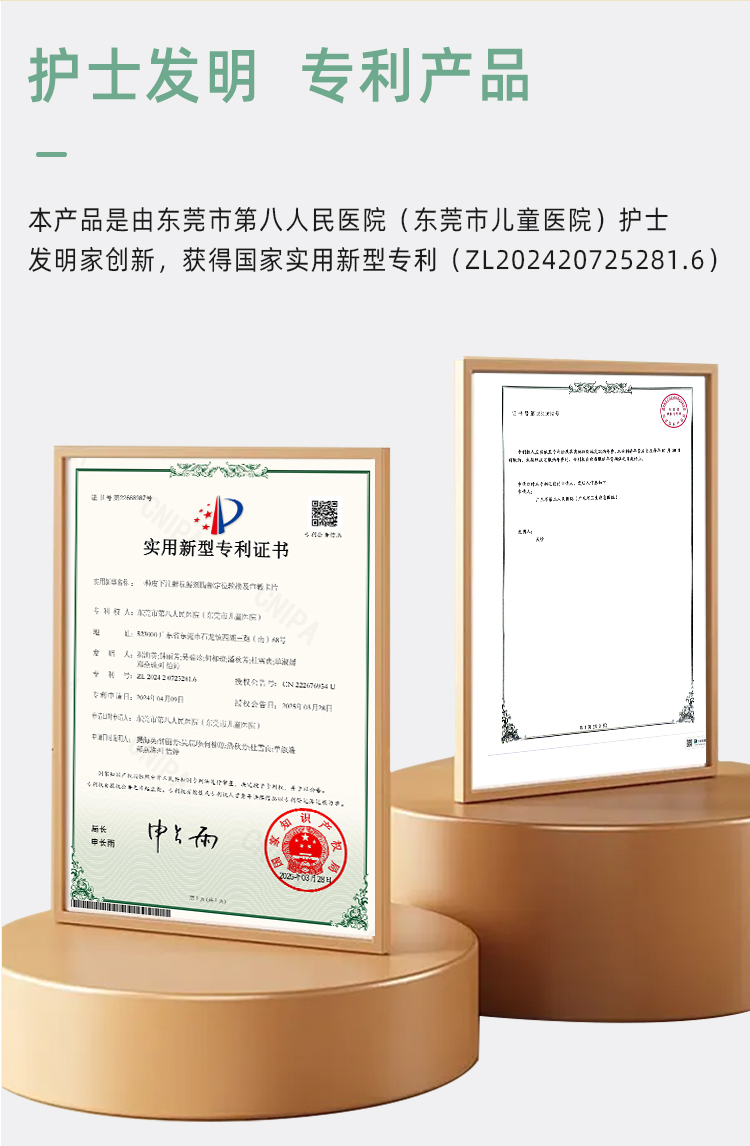 本產(chǎn)品是由東莞市第八人民醫(yī)院(東莞市兒童醫(yī)院)護(hù)士發(fā)明家創(chuàng)新,獲得國家實(shí)用新型專利(ZL202420725281.6)。