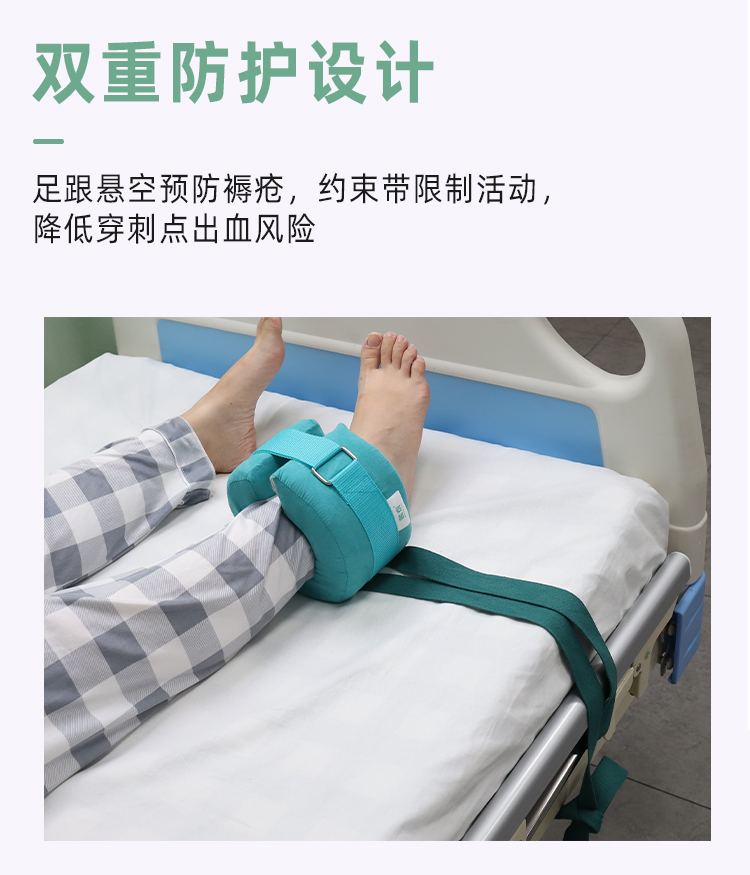 足跟懸空預防褥瘡,約束帶限制活動,降低穿刺點出血風險。