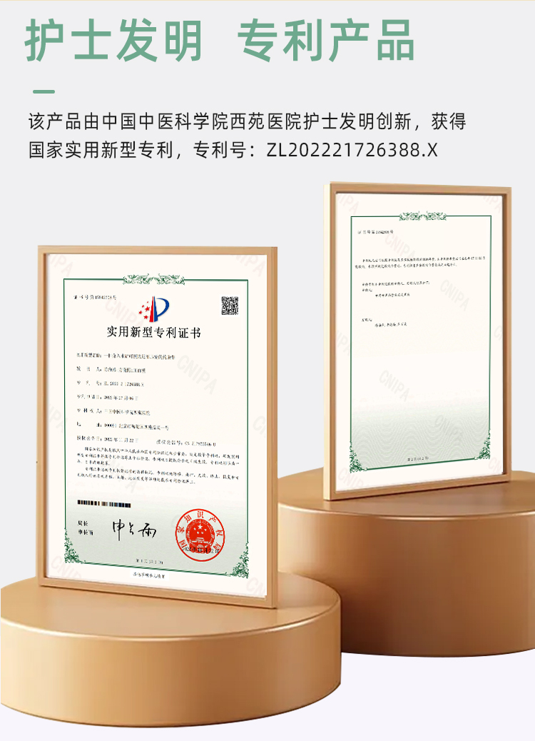 該產品由中國中醫(yī)科學院西苑醫(yī)院護士發(fā)明創(chuàng)新,授權蒙泰轉化而來的專利產品,專利號:ZL202221726388.X。